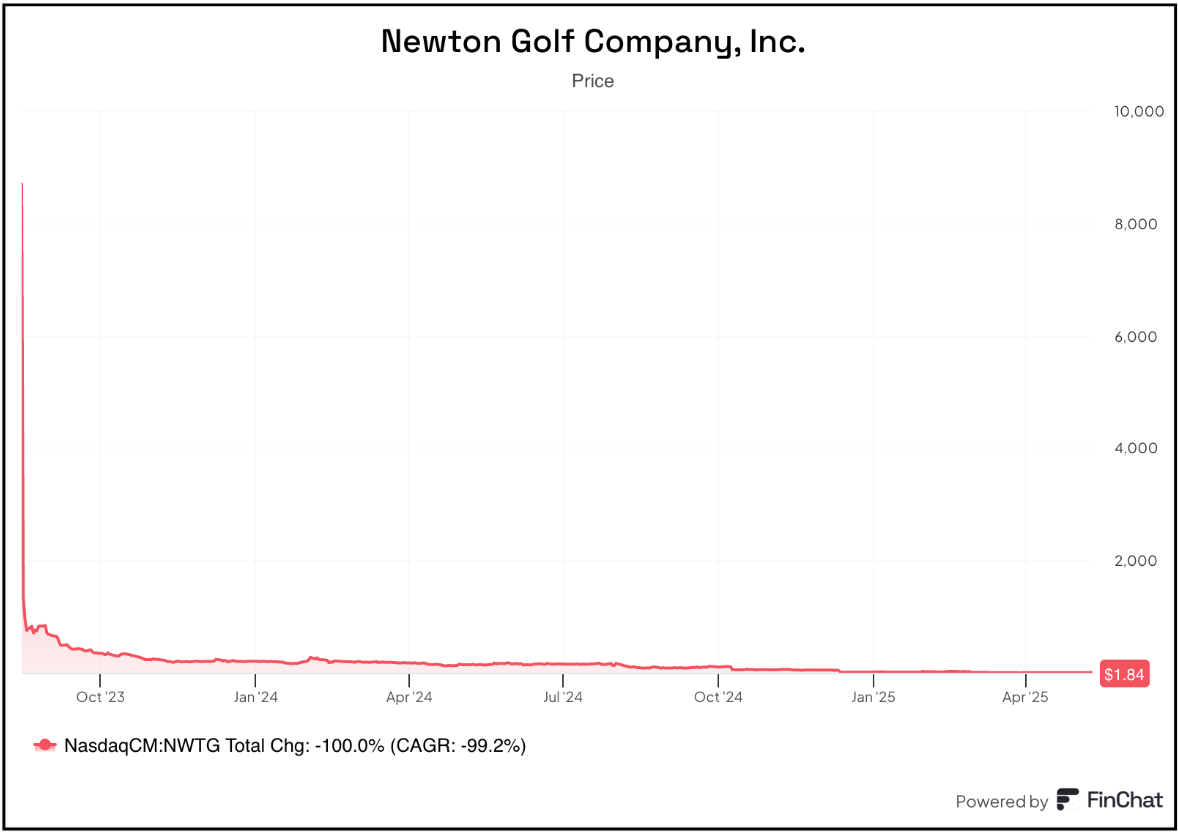▶Finally – sudden thought... I was going through some old reports and noticed that back in 2023 I wrote about the zany market action in the stock of a company called Sacks Parente, which had just gone public via an IPO. Its claim-to-fame is a $400 putter my golfing friends have never heard of. Still it made the headlines because its stock shot up 600% on its first day of trading. I looked it up to see... where is it now? Couldn’t find it. Turns out it changed its name to Newton Golf $NWTG and earlier this year did a 1-for-30 reverse stock split. Not just a reverse split, but...ONE FOR THIRTY! Now (drumroll) let’s look at its stock...