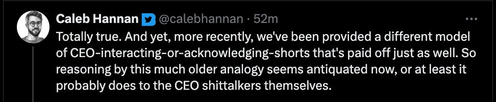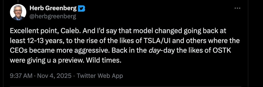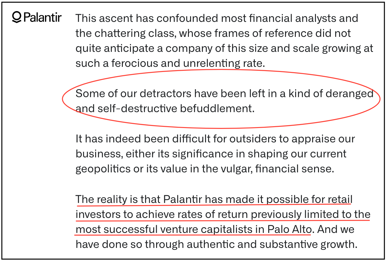 I’ve never written about or opined on Planatir because it’s too much of a black box. And I’ve also stood in front of one speeding locomotive too many. But when I see a CEO not only go off on the shorts, and I see a guy whose stock is up nearly 200% this year using words like “deranged” and “self-destructive befuddlement” to describe his company’s “detractors,” I’m thinking… why?