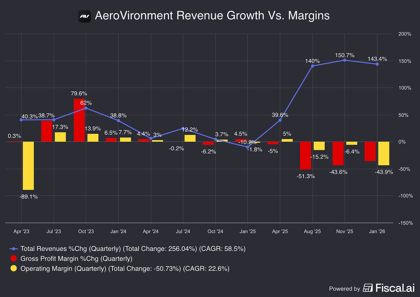 Now, AeroVironment is generating profitless growth, thanks to BlueHalo’s lower-margin services contracts and immature products that haven’t yet reached commercial scale. Or as CFO Kevin McDonnell put it on the earnings call…