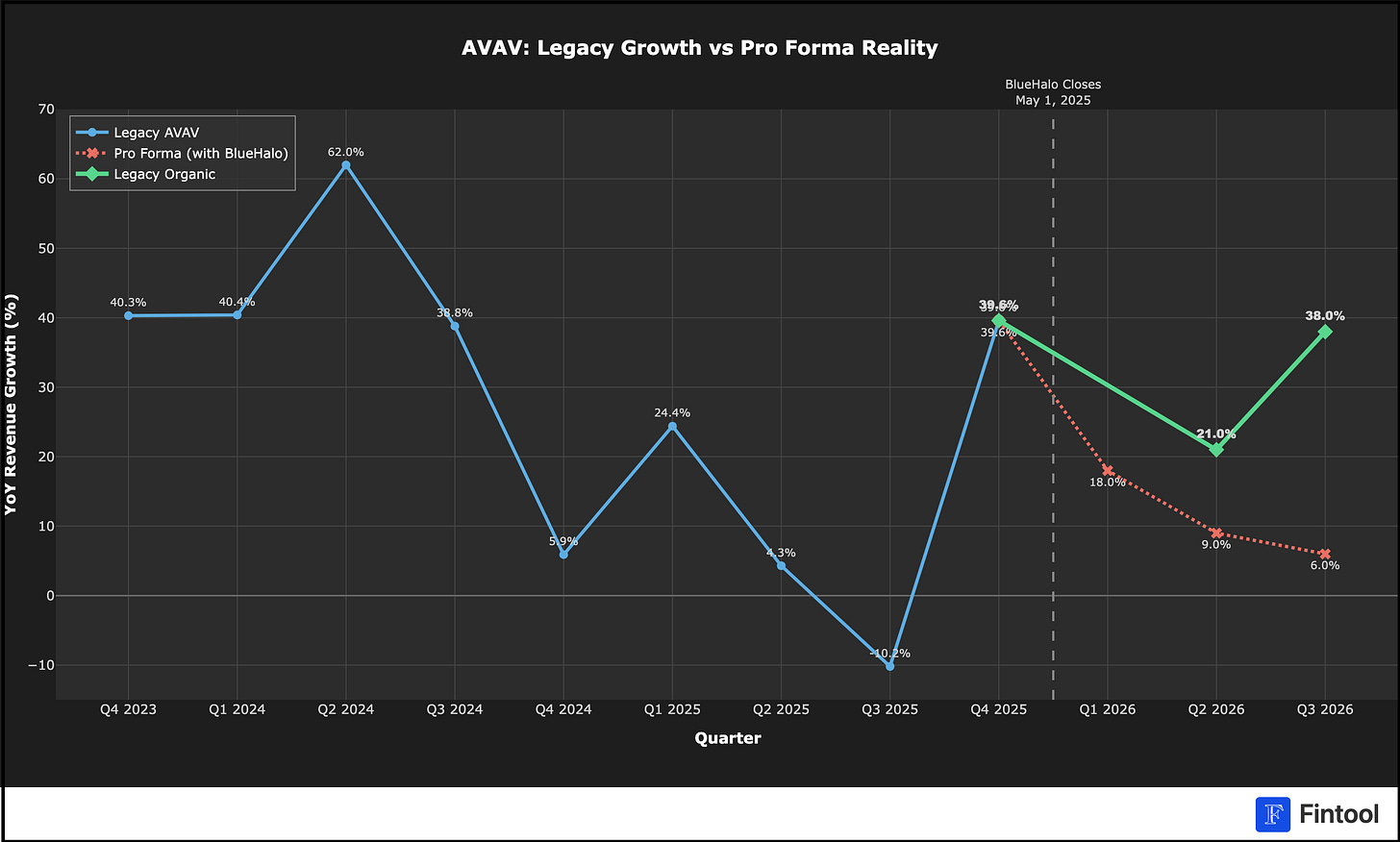 The irony is, AeroVironment’s legacy business is actually doing fine, but BlueHalo appears to have been nothing short of a disaster. If nothing else, this chart of legacy organic vs. its post-acquisition pro forma growth shows just how bad the deal has been…
