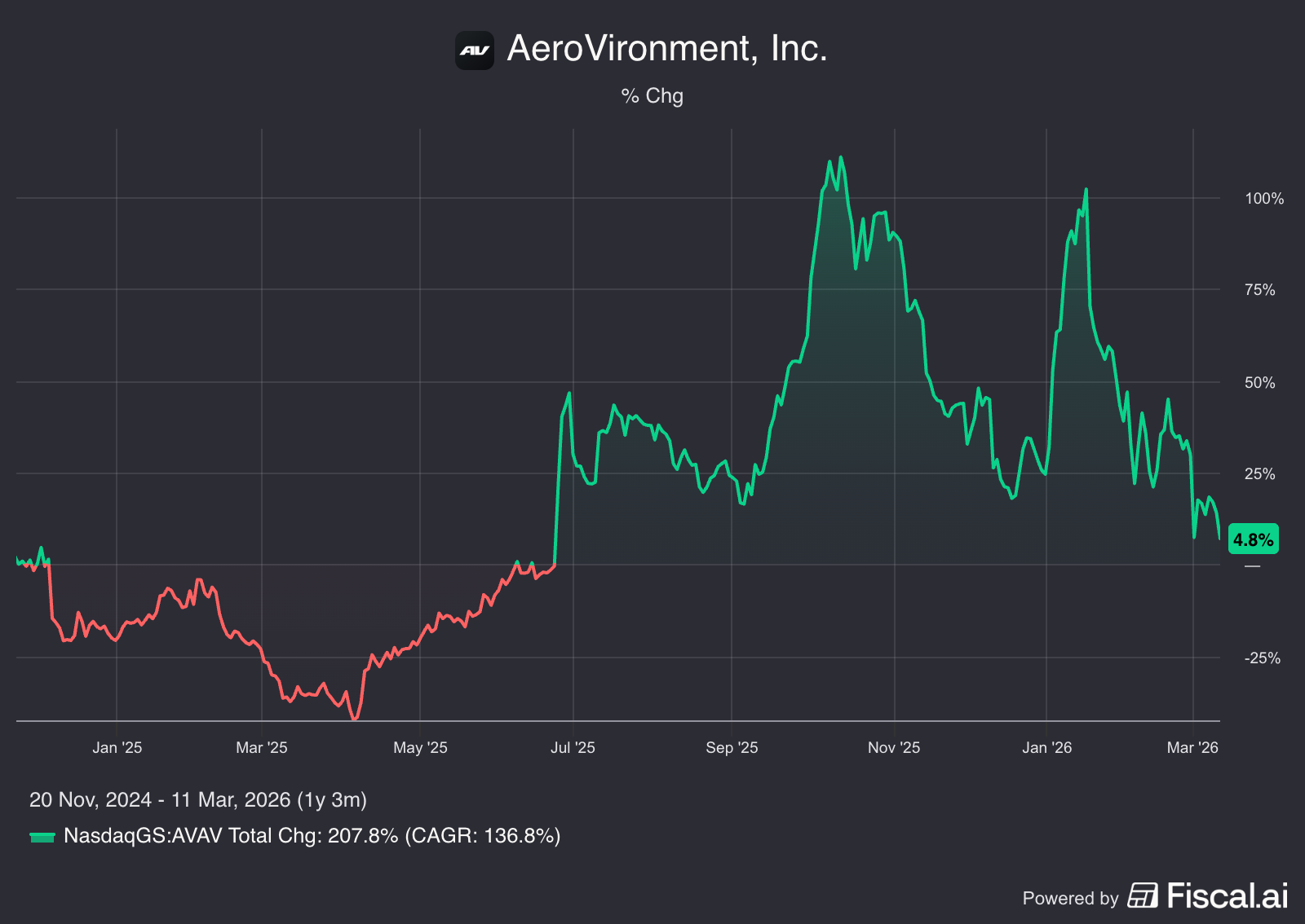 The reason it’s misfiring – highlighted by yesterday’s Q3 quarterly miss – appears to be the very reason I formally red-flagged AeroVironment in November 2024…. right before it took off like a rocket and doubled! (Never mind that it has since done two near-complete round trips, losing half its value over the last two months.)