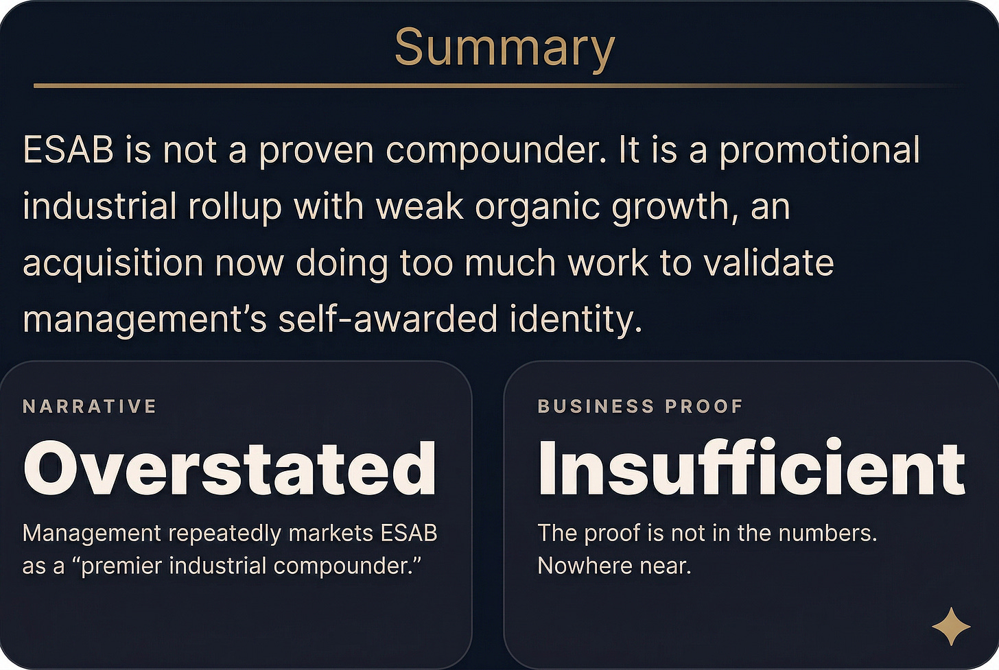 Welcome to the over-the-top promotional world of ESAB ESAB 0.00%↑, a rollup of welding equipment that was spun off a few years ago from Colfax Corp., which at the time of the ESAB spin rebranded itself as Enovis ENOV 0.00%↑.