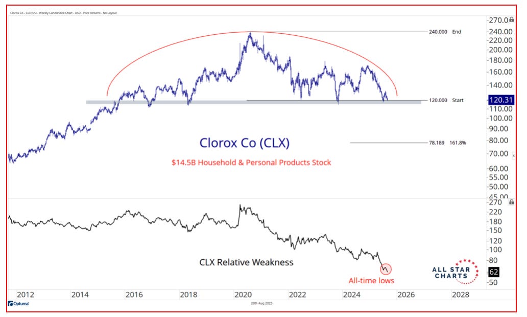 But the catalyst for why now is what I saw from my pal Steve Strazza at All Star Charts, who focuses on the technicals. In a report the other day on potential shorts based on the charts, he zeroed in on Clorox, with this chart...