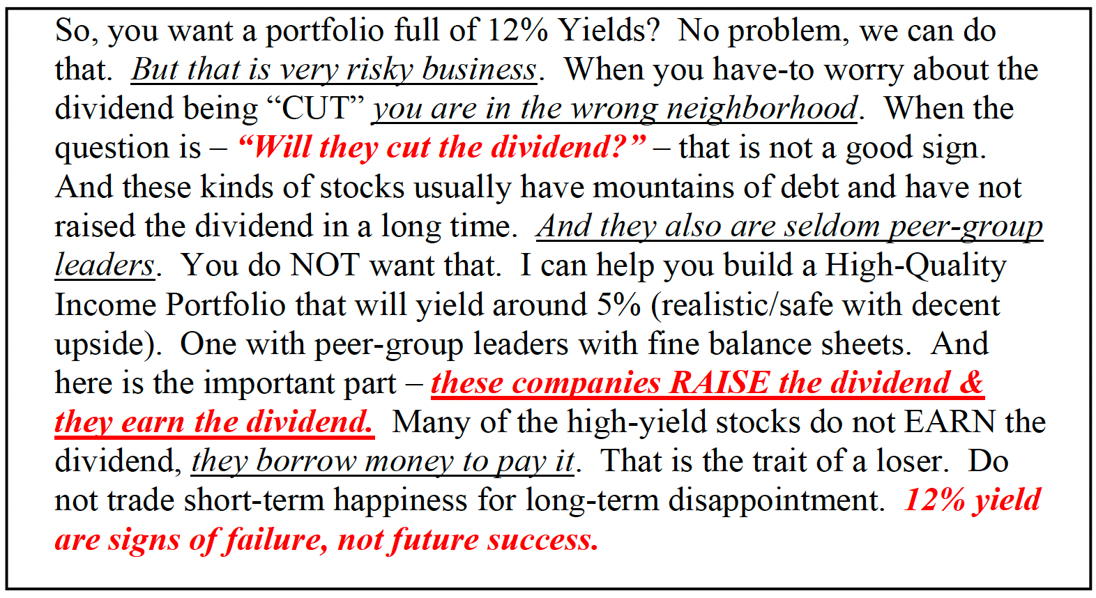 We are TERRIBLE market timers – SO DON’T EXPECT THAT FROM US.