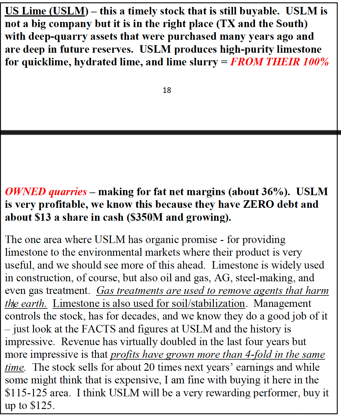 What struck me in going through the December issue of his newsletter was that Bob commented on 74 companies and ETFs. You’ve likely never heard of some, but he has researched all of them, like US Lime USLM 0.00%↑ …