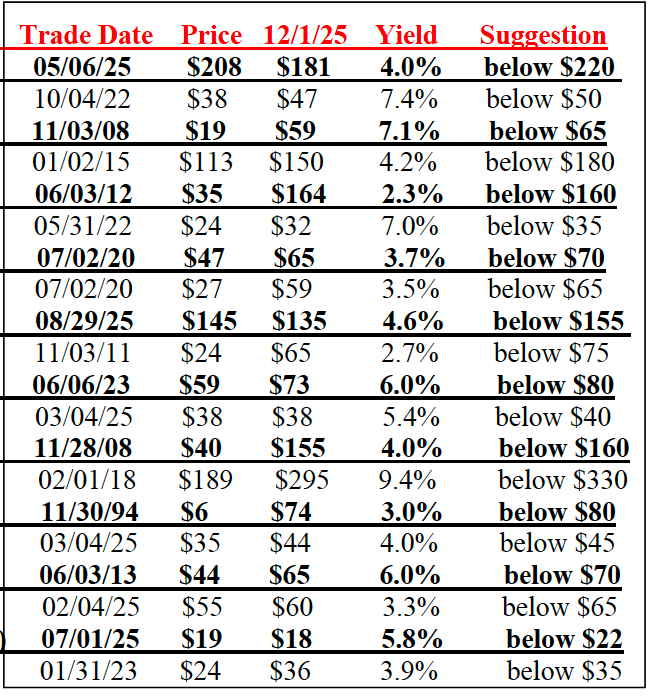 Like Bob’s comments on dividend payers. In his December issue he listed 20 ideas under the category, “Income Stocks For Yield & Modest-To-Decent Growth.” Here they are without the names…