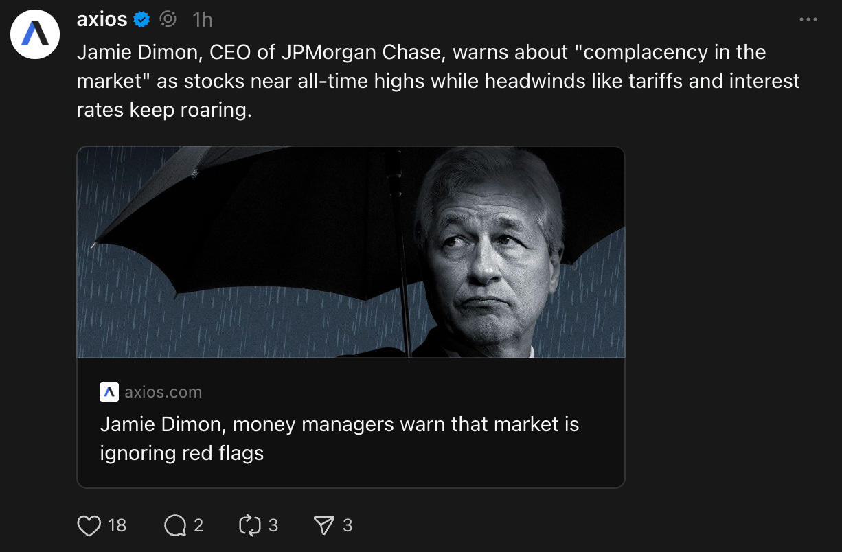 Actually, it was the headline: “Jamie Dimon, money managers warn that market is ignoring red flags.” To which I thought: Ya think? The knock on Jamie Dimon is that he’s often overly cautionary. I’d say he’s appropriately realistic. After all, he runs the country’s largest commercial bank – JPMorgan Chase ($JPM) – giving him a unique insight not just into the economy, but business trends.