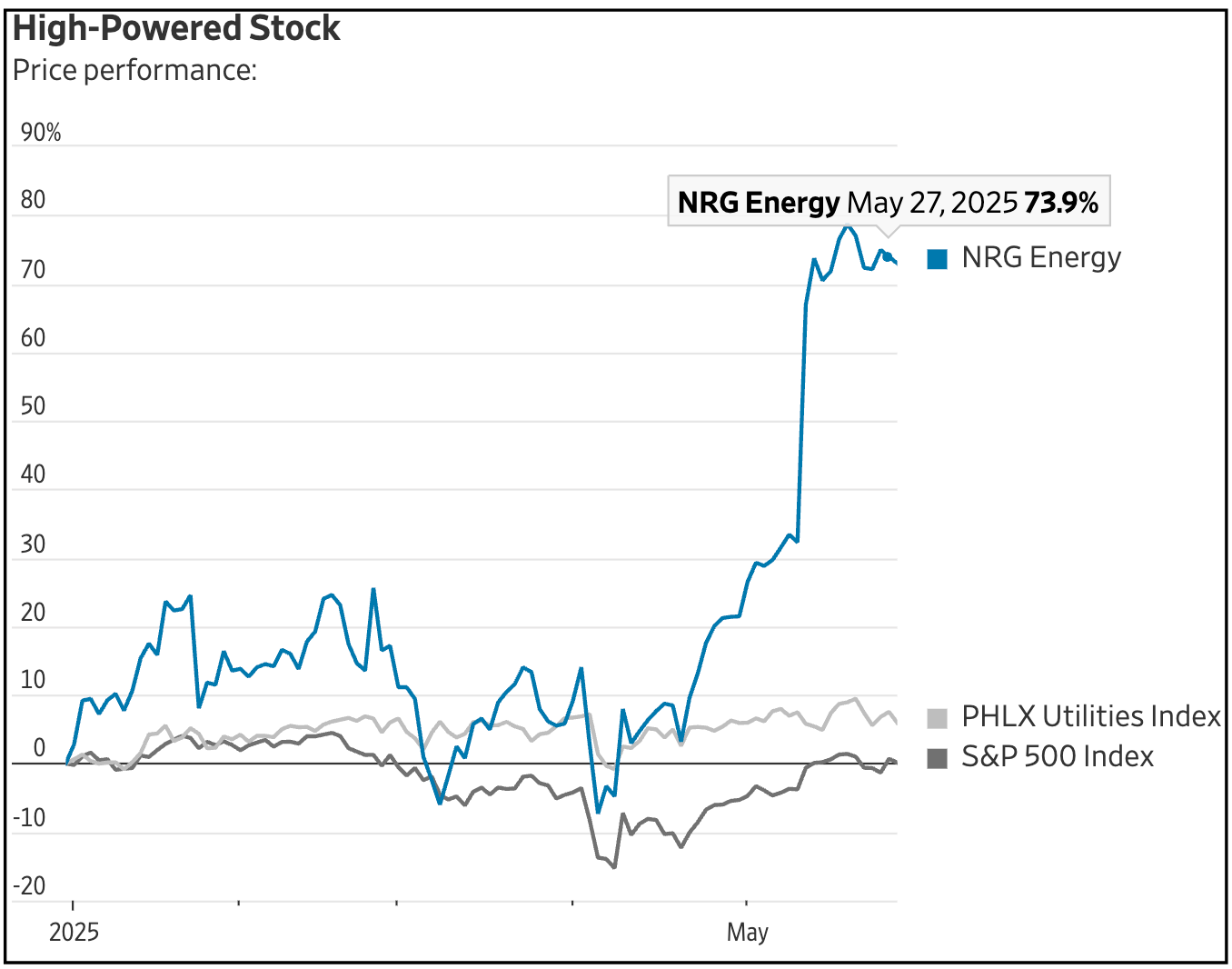 That’s important, because as this chart from the WSJ shows, NRG has been one of the S&P 500’s biggest year-to-date gainers – whose shares have outstripped all utilities in part because of... its earnings.