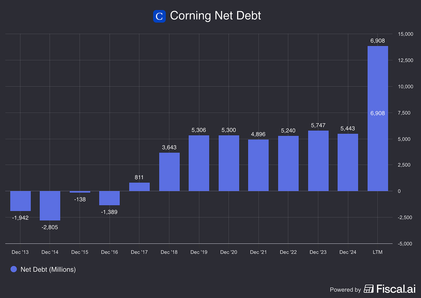 As it turned out, there was a glut of capacity as customers either froze their Capex budgets or went bankrupt. Corning itself has loaded up on debt to expand fiber optics capacity.