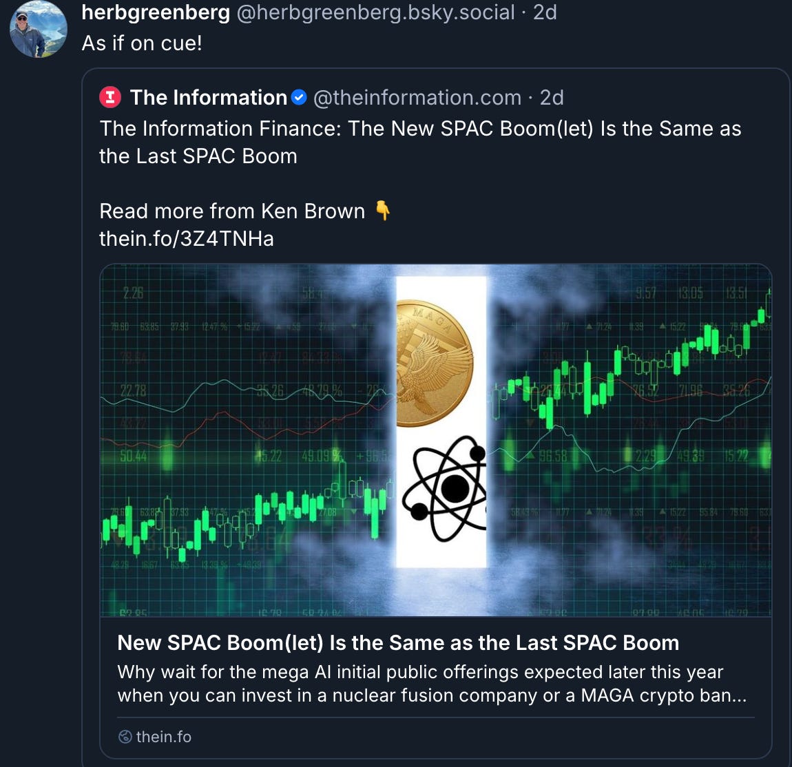 I even reposted it on social media, as if Ken’s SPAC story landed “on cue” for this phase of the market.