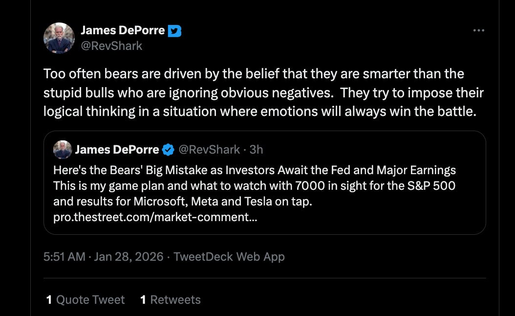 And why wouldn’t they, based on what they see in the charts, with the S&P 500 hitting and blasting through the all-important 7,000? Therein lies a bull/bear battle of the charts. Or as another old friend and long-ago nemesis, the currently bullish technical analyst Jim “Rev Shark” DePorre put it on Wednesday…