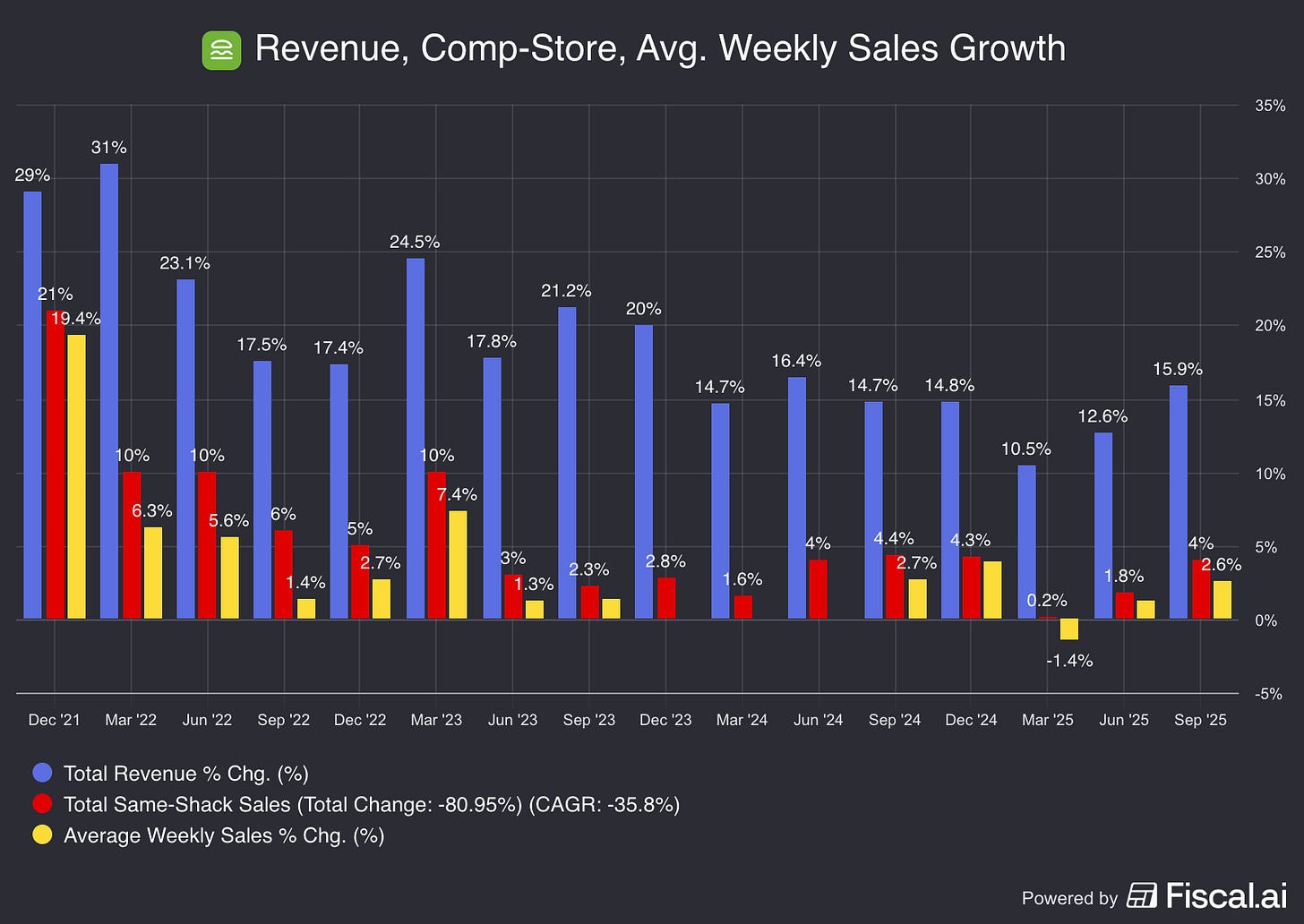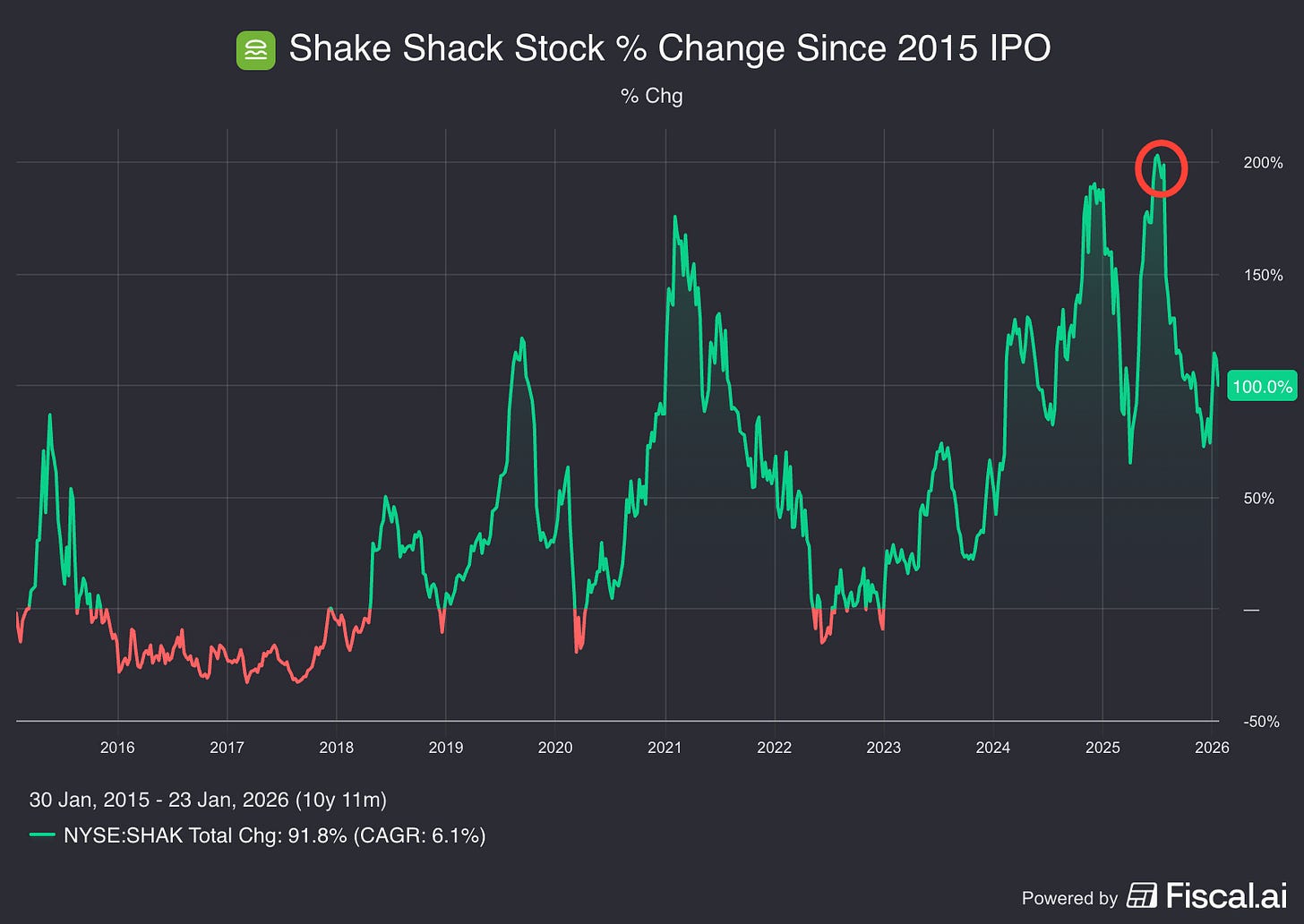 Then, during Office Hours last week, one subscriber, a professional investor I happen to know, mentioned why he was short the Shack. (And short, I should add, as a long-term trade that he believes will take time to play out.) This is a guy who also happens to be mostly a growth investor; he also has good instincts on shorting broken growth stories, especially after the stocks have tumbled.