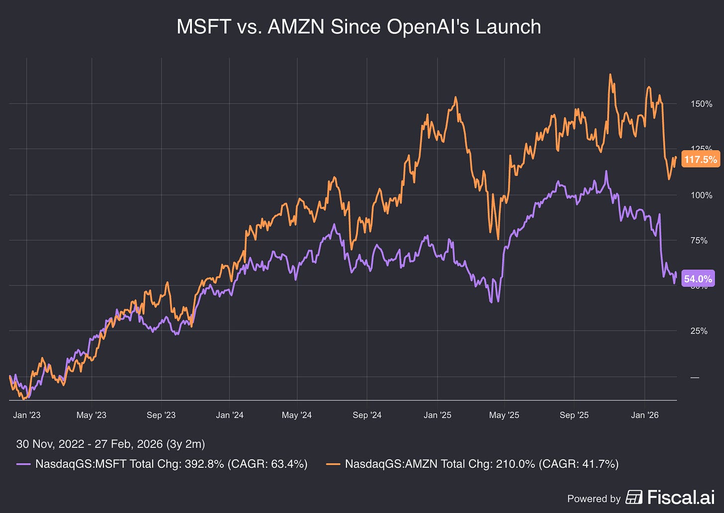 Time was, not that long ago, such an announcement would have been a launchpad for its stock, as was the case for Microsoft MSFT 0.00%↑ after OpenAI was first rolled out in late 2022. That was followed less than two months later by reports that Amazon was investing $10 billion into the company. That news lifted all boats, including Amazon. Today, one seems more desperate than the other…
