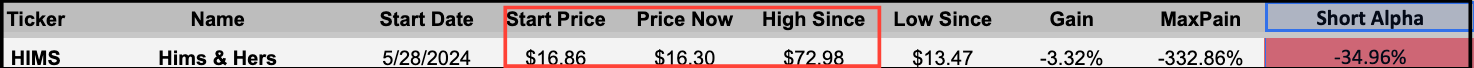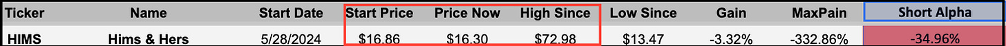 Watching the stock rise 333% was no fun, especially when the real story was there for all to see: that without its allegedly illegal compounded versions of GLP-1s, Hims’ core business was getting clobbered. The government’s rollout of its own online RX portal, which sells GLP-1s, in turn led to a regulatory assault on HIMS and sped up the inevitable. (Side note: That last part gets lumped into the bucket of the new wild card to any investment thesis, long or short, of the government taking a stake in companies and industries. In this case, it’s the reverse of what happened to MP Materials MP 0.00%↑after it was red-flagged here.)