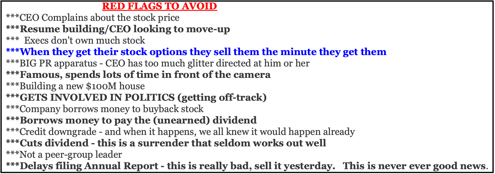 Quite a few of his red flags are on my own list, including a CEO’s focus on the stock price. And an infatuation with being in the media, however it’s defined today. (Says to me they’re either believing their own b.s., or know it is and have stock to sell – so you do, too!)