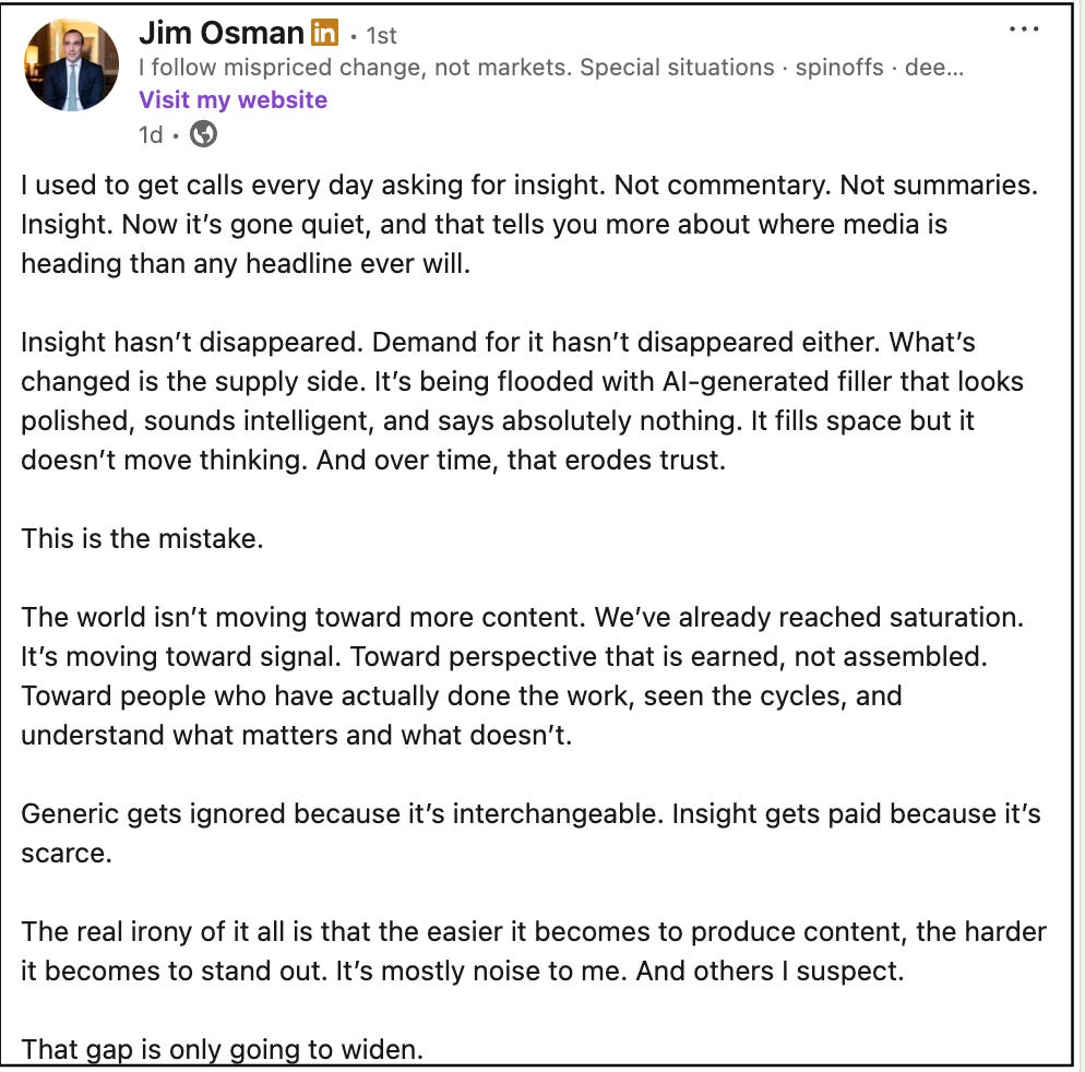 That’s the thing with AI… It’s a tool. But without the human element, there’s a strong likelihood the result will devolve into noisy, empty mediocrity.