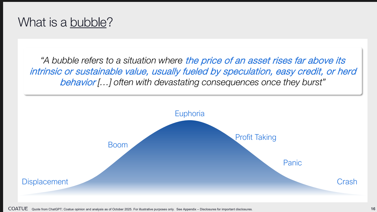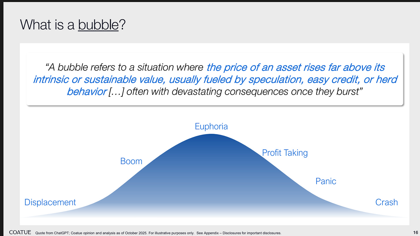 ▶Speaking of the times, and oh what a time this is… Since we’ve been talking bubbles, one obvious question: What’s the definition of a bubble? I’ll give you two different views. The first is from Coatue’s presentation…