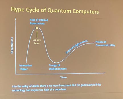 ▶Speaking of bubbles, one that has nothing to do with AI… a friend sent this from a presentation he attended last week in Minneapolis by Christopher Monroe, who co-founded and now serves as Chief Scientific Advisor for IonQ $IONQ, whose stock has been among the most controversial in the quantum computing space. The title was “Hype and Hope”….
