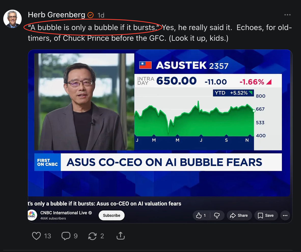 Sensible. The second is from the CEO of a Taiwanese-based company. During a CNBC Asia appearance, he was asked whether we’re in an AI Bubble. As I put it in a social media post, he said…