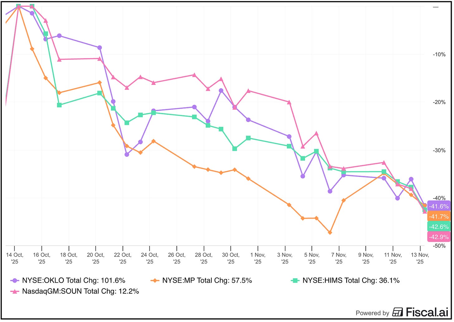 ▶Every week is a week to pay attention to red flags… But this week capped a few weeks that should serve as a reminder that in the end – with sanity starting to hit some of the silliest – the laws of gravity ultimately apply. Notably among those on my Red Flag Alerts list that had experienced rocket ship-like blastoffs were MP Materials $MP, Oklo $OKLO, Hims & Hers $HIMS and Soundhound $SOUN. All are still up considerably since I took my first swipes, but taking into account the total drawdowns, each has gone through its own version of a mini-smash crash.
