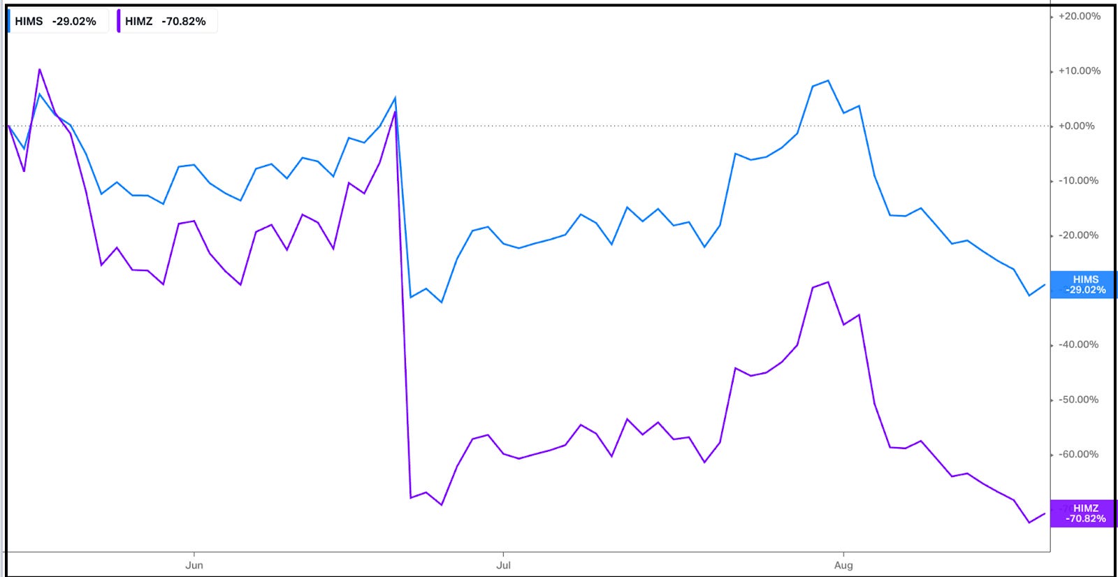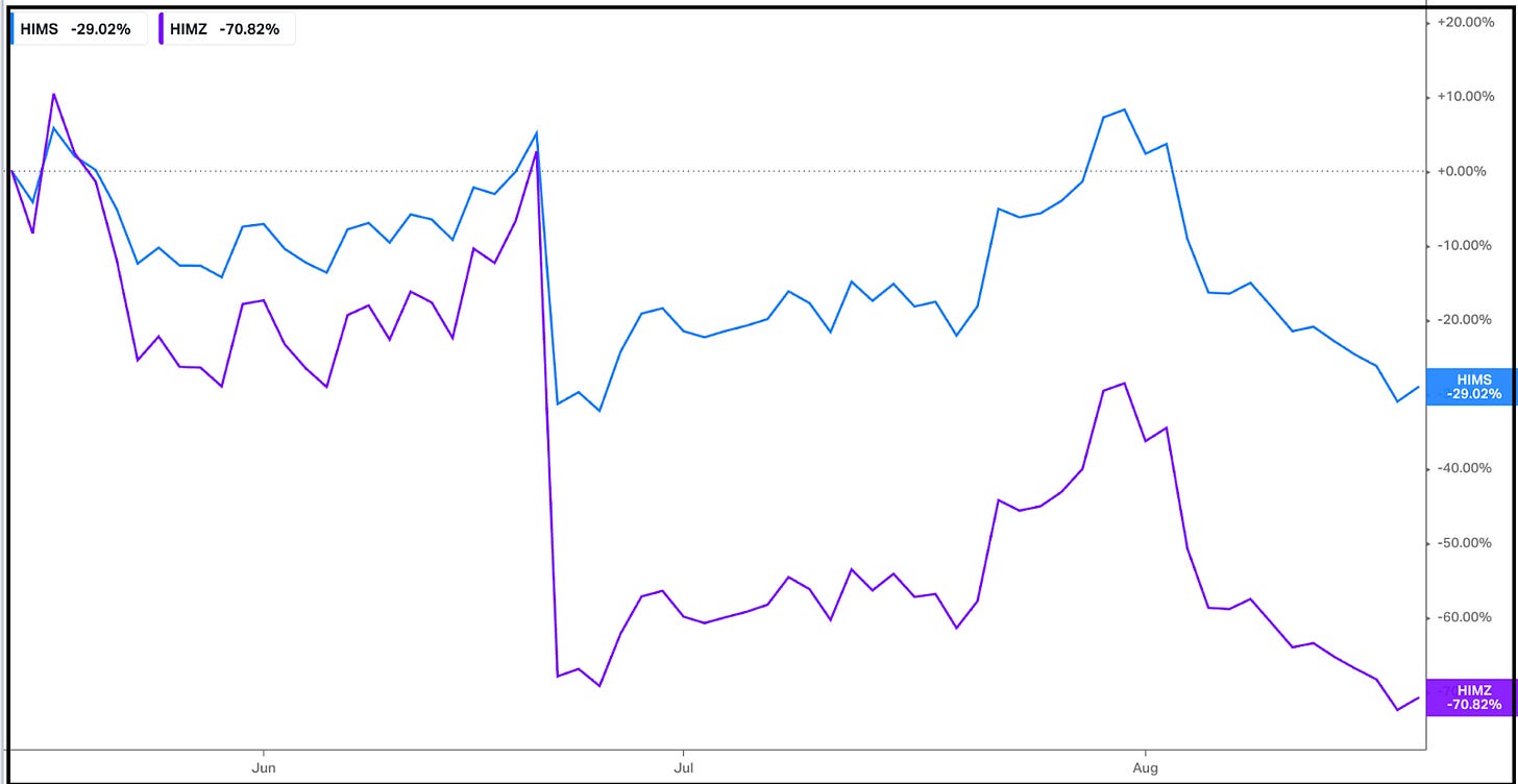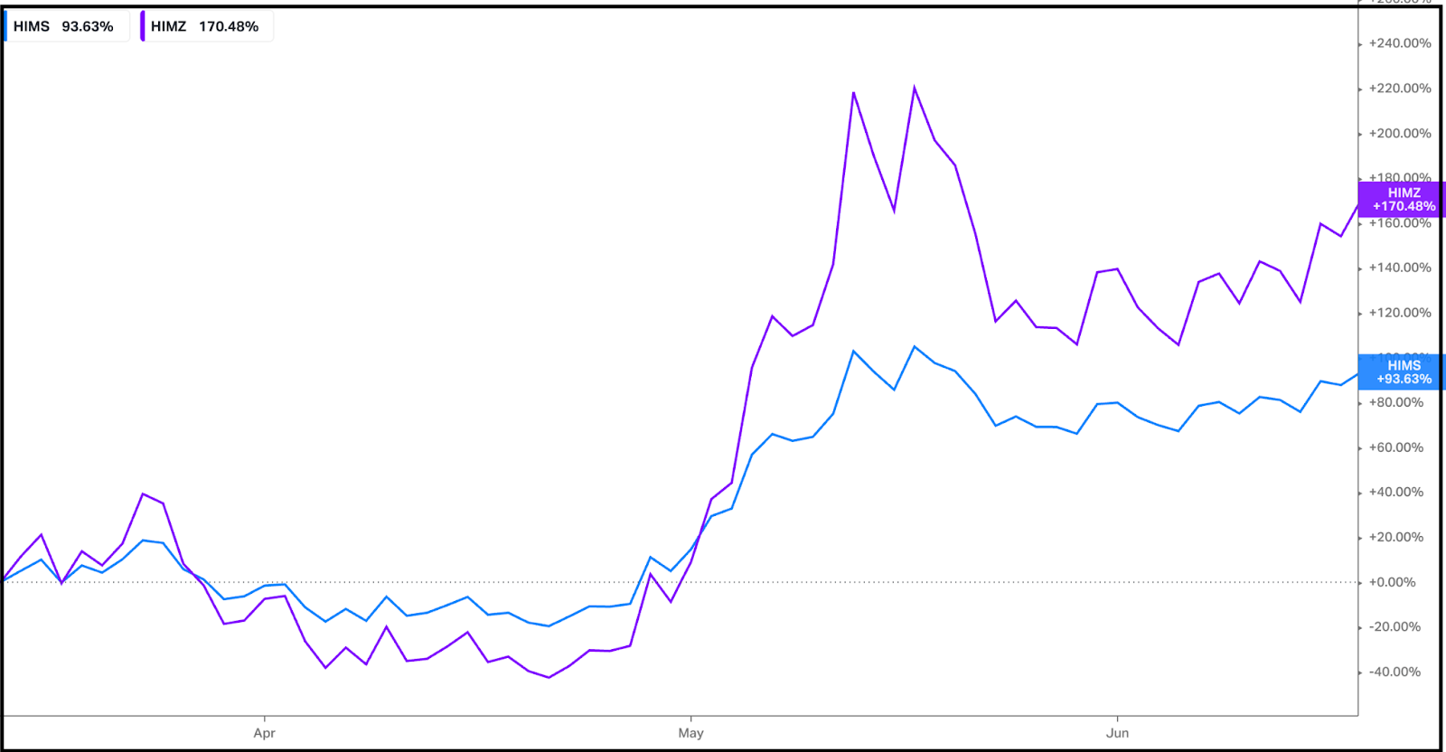 For a quick snapshot on how vulnerable this kind of leverage is, let’s look at the leveraged play on Hims & Hers HIMS 0.00%↑, one of the biggest “we’ll show him” stocks among those I’ve red-flagged. Its leveraged doppelgänger is the Defiance Daily Target 2X Long HIMS ETF HIMZ 0.00%↑ . On the way up, shortly after it was created, HIMZ left Hims in the dust...