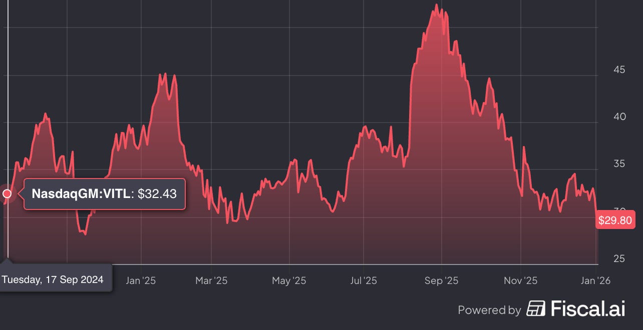 After rising roughly 70% at one point since I started coverage, Vital Farms VITL 0.00%↑ is finally back to below or roughly at the price when I first wrote “The Shell Game” in September 2024, depending on the day…