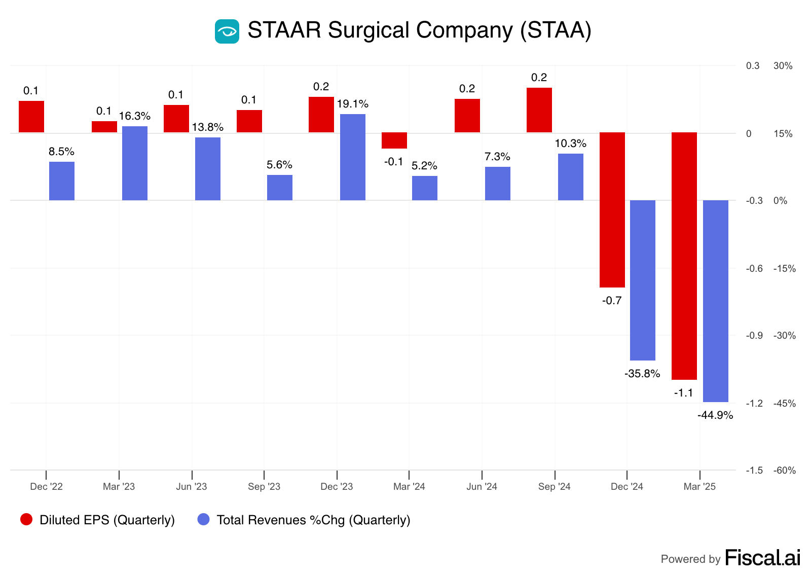 Staar had originally landed on the Red Flag Alerts list because of lousy earnings quality and the fact that most of its business came from China and one customer generated more than half its revenue. Things haven’t improved since, as this simple chart on revenue growth and earnings per share shows...
