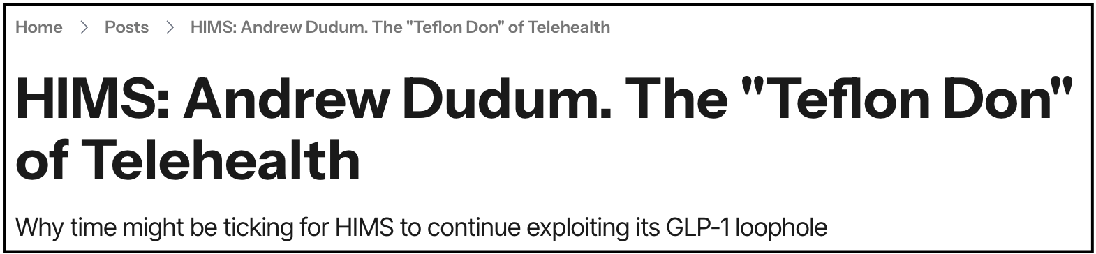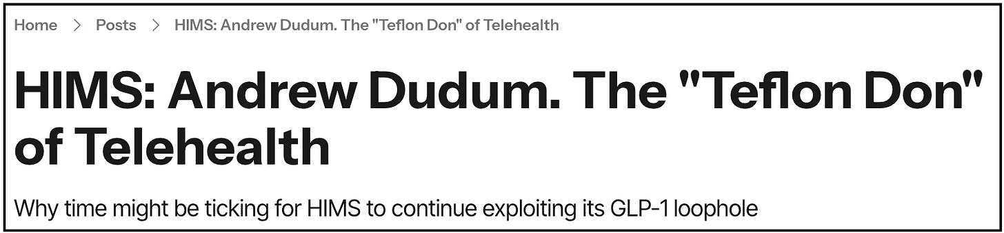 I first red-flagged Hims well over a year ago at much lower prices, based largely on the declining growth of its underlying core business – much of it obfuscated by the unsustainable growth of its tilt to compounded GLP-1s. It has gone on to be one of the nuttiest, most irrational stories out there... with the stock defying all odds.
