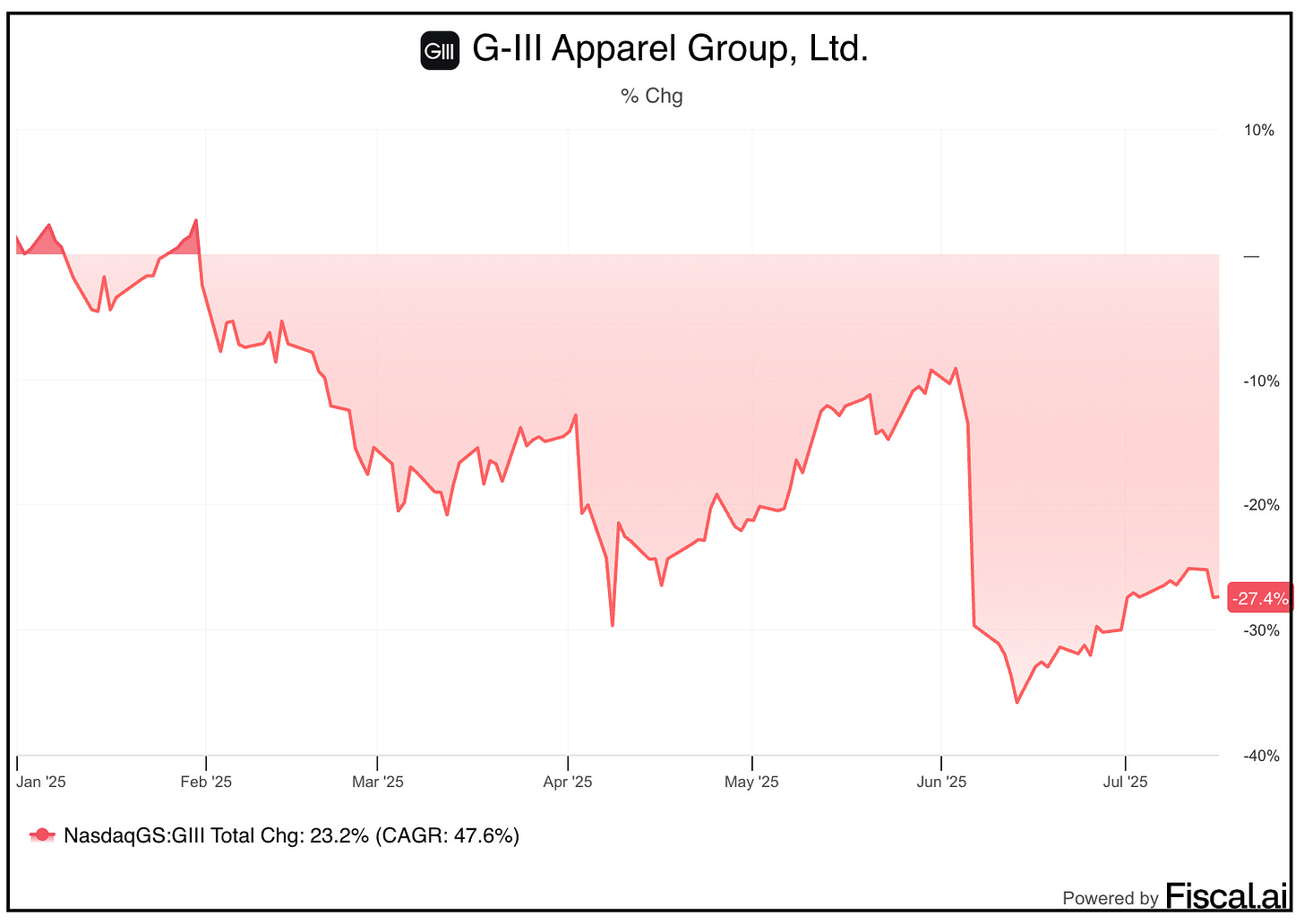 Enter G-III Apparel Group $GIII, which owns and licenses around 30 popular fashion brands, including Donna Karan, DKNY, and for a brief time longer, PVH’s Calvin Klein and Tommy Hilfiger. G-III recently lost nearly a third of its value over the course of one week in June after disclosing an unexpectedly high tariff impact and withdrawing guidance, citing tariff concerns.