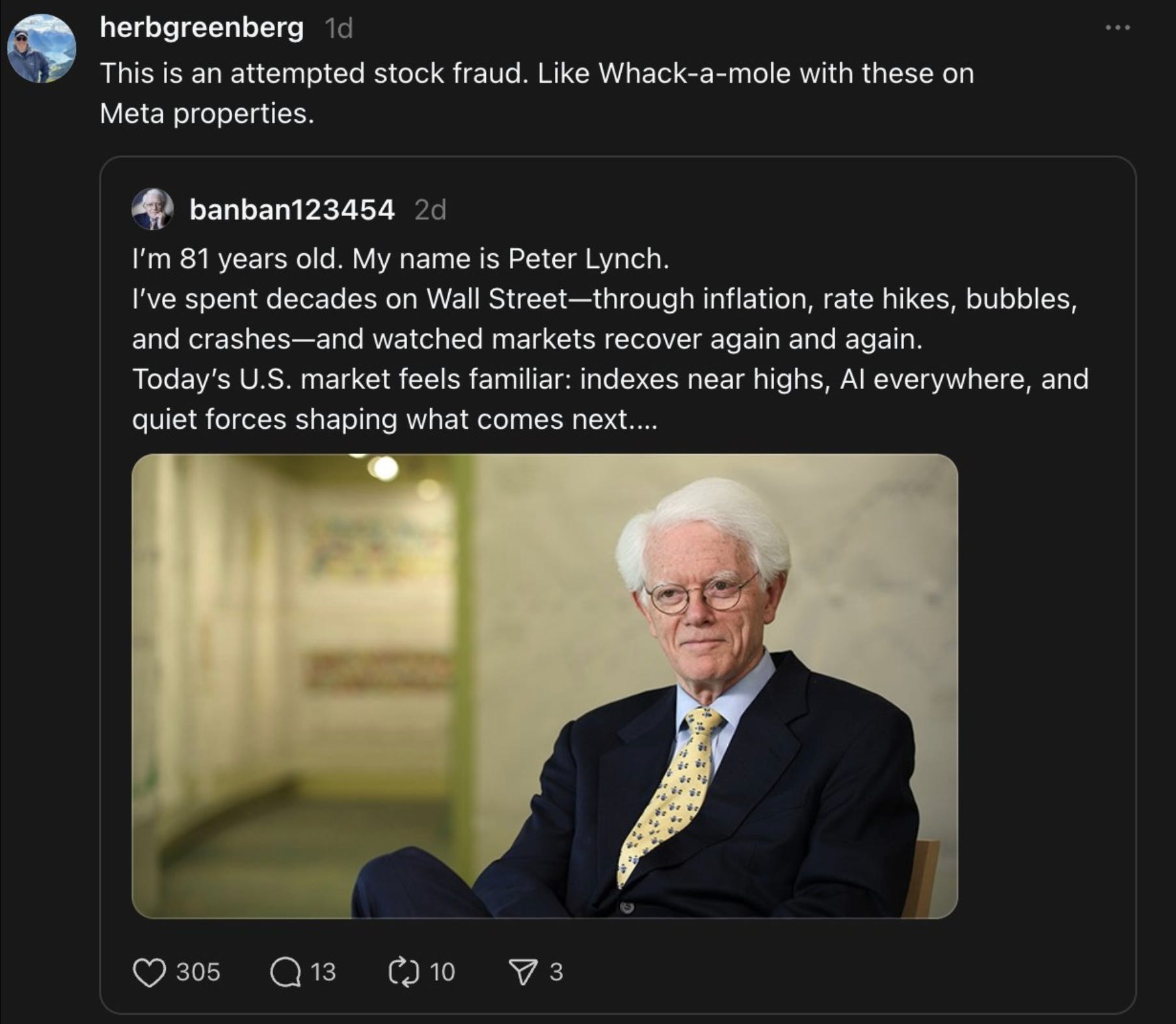 Ironically the biggest wins this year among Red Flag Alerts were a few Chinese stock frauds whose shares plunged to pennies within days or weeks of my reports. Believe it or not, new versions of these frauds continue to pop up on Meta’s META 0.00%↑ Facebook, Instagram and Threads… or at least they did as recently as this past week. This is my reaction to one on Threads…