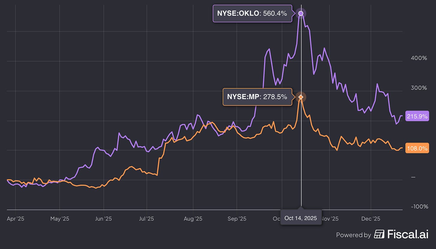 Without question, the two biggest misfires, on my end, were Oklo OKLO 0.00%↑and MP Materials MP 0.00%↑. The below chart shows both, with the start date as of my my Oklo report in March, which was followed by MP a month later…